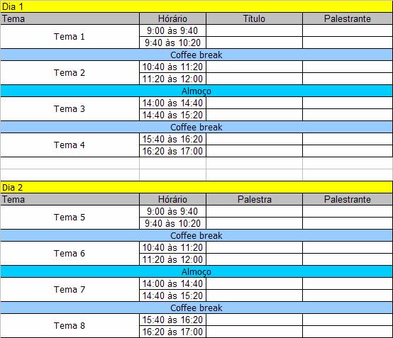 O formato de grade abaixo é uma proposta de duração do encontro, palestras e refeições. A datas sugeridas para a realização deste encontro são: 19 e 20 de junho 26 e 27 de junho 24 e 25 de julho 7 e 8 de agosto Clique aqui e informe a data de sua preferência